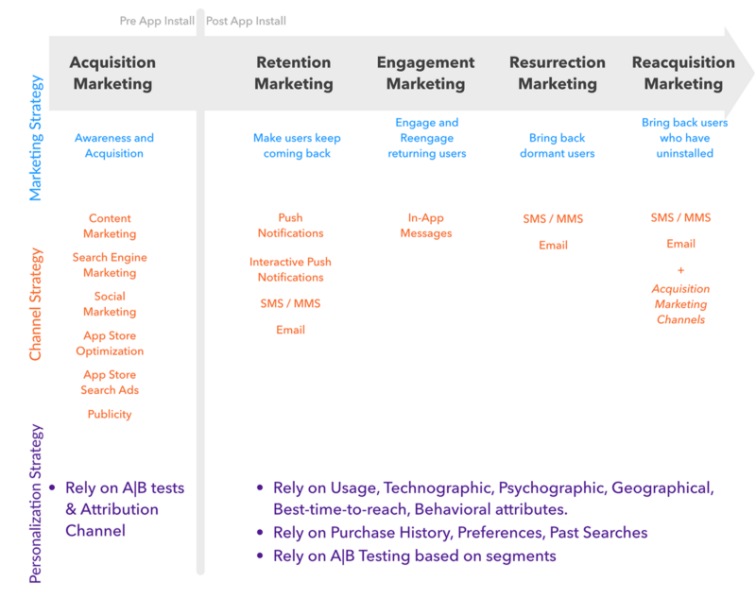 Growth Marketing Strategy depends on the stage of the user with your app or service. Personalization techniques are widely used in retention, engagement, resurrection and reactivation marketing.