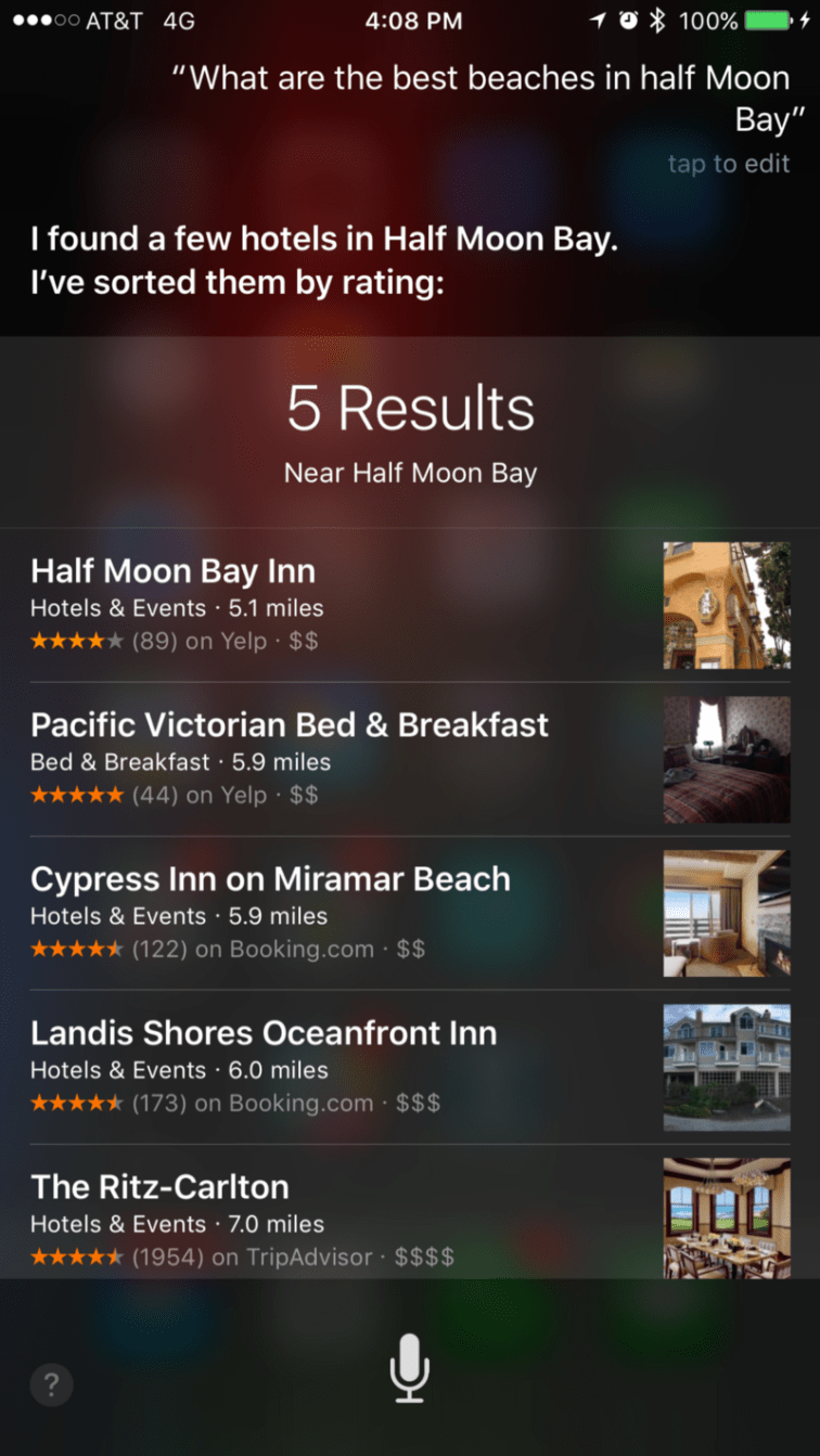 Siri interpreted the question as “Which are the best hotels in Half Moon Bay?”.
