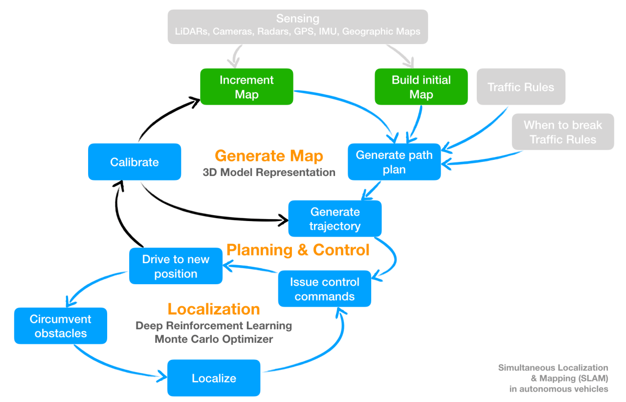 Autonomous vehicles use data from multiple sensors to concurrently build a map i.e. 3D model representation of the environment and localize the vehicle in map i.e. navigate the vehicle within the confines of the map while circumventing obstacles.